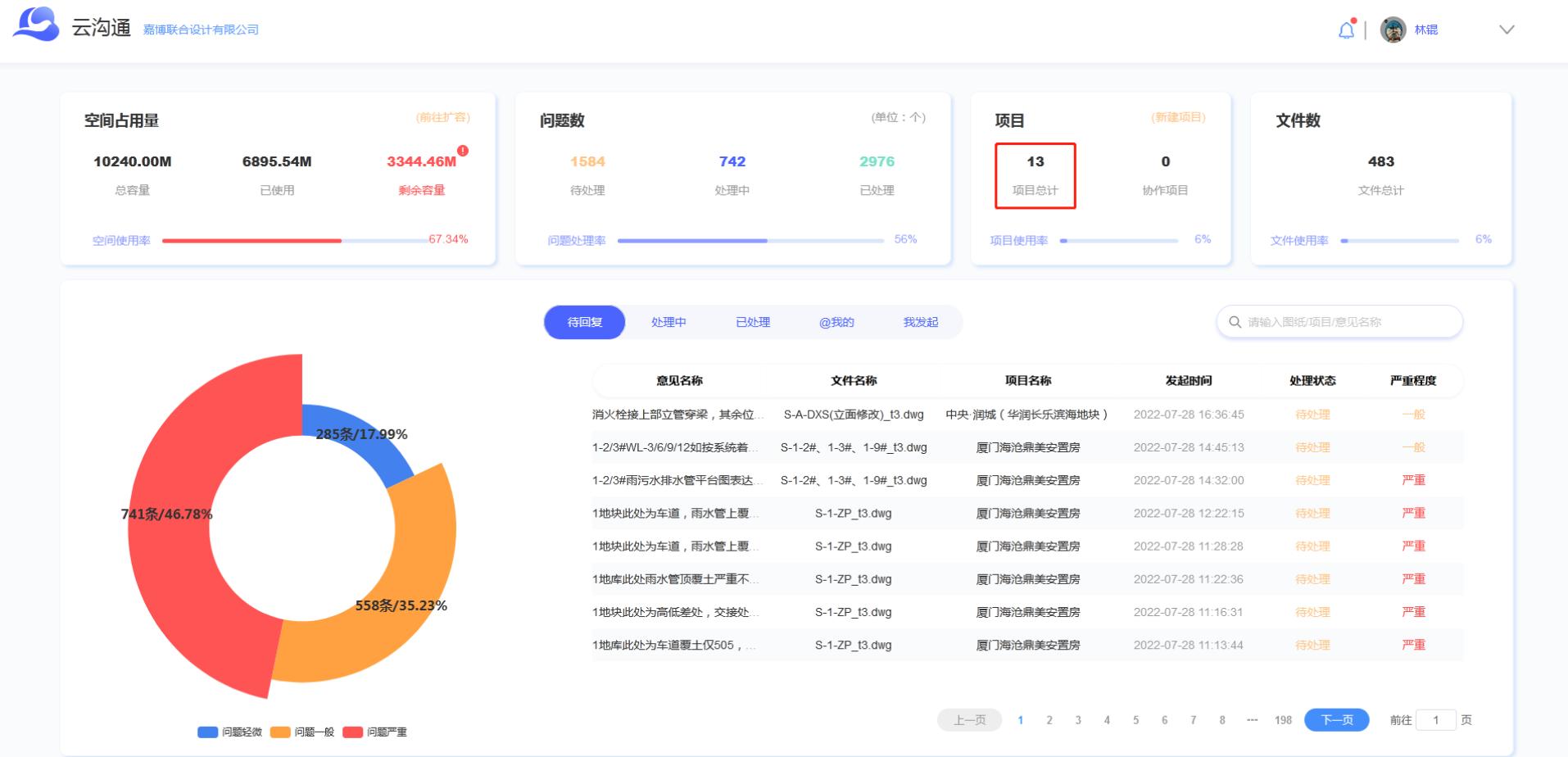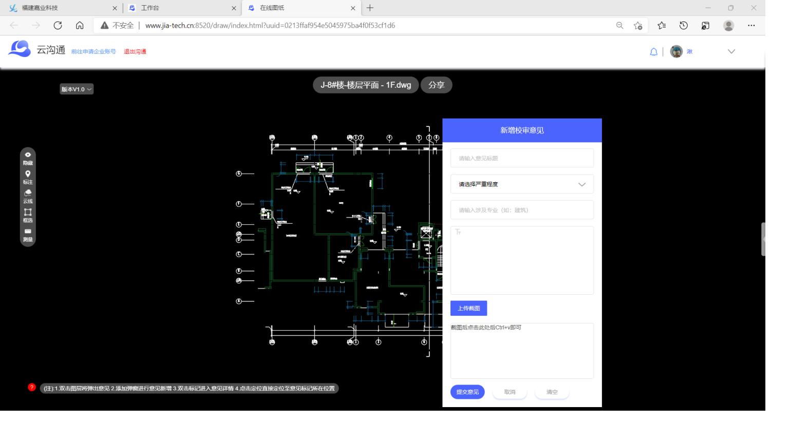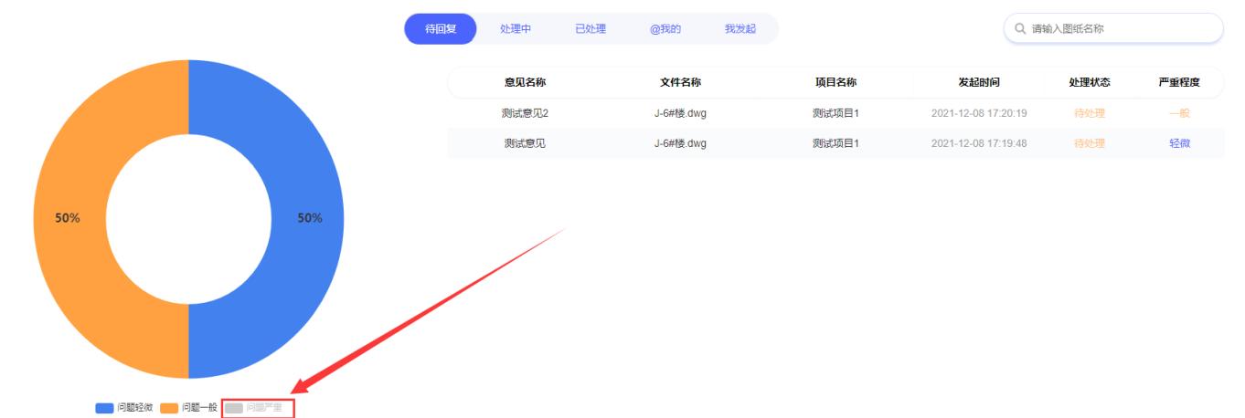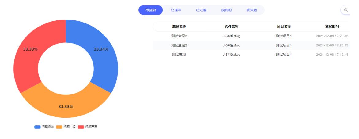 11、返回工作台界面可以看见在下方已经出现了添加的意见,已经该意见所属的项目和该意见的严重程度,对应的图纸名称,直接点击该名称可以直接来到图纸页面