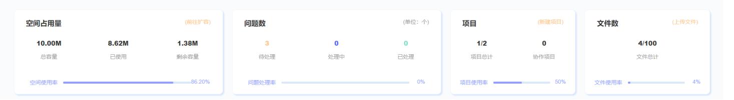 3、界面中部—当前账户的使用情况(空间用量,问题数,项目数,文件数