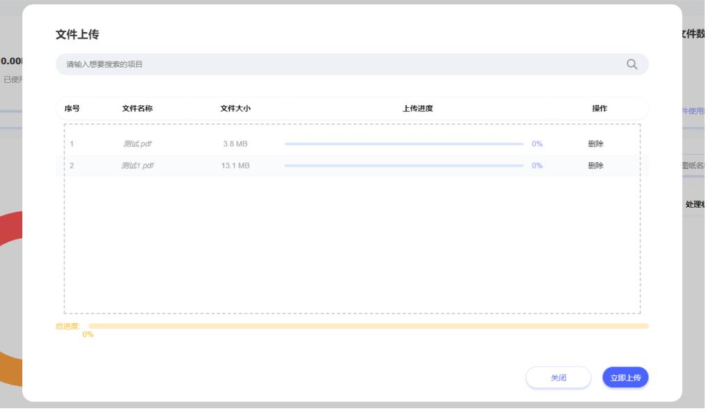 2、在弹出的对话框中可以选择点击选择文件上传,或者直接拖拽文件进对话框进行上传(可多文件一起上传但上传文件不能重复)